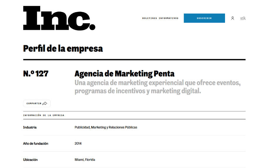 Miami, FL – En un mercado que exige agilidad y resultados tangibles, la consistencia es el mayor indicador de éxito. Por tercer año consecutivo, Penta Marketing Agency ha sido reconocida en la prestigiosa lista Inc. 5000, consolidándose como una de las empresas privadas de mayor crecimiento en los Estados Unidos.
